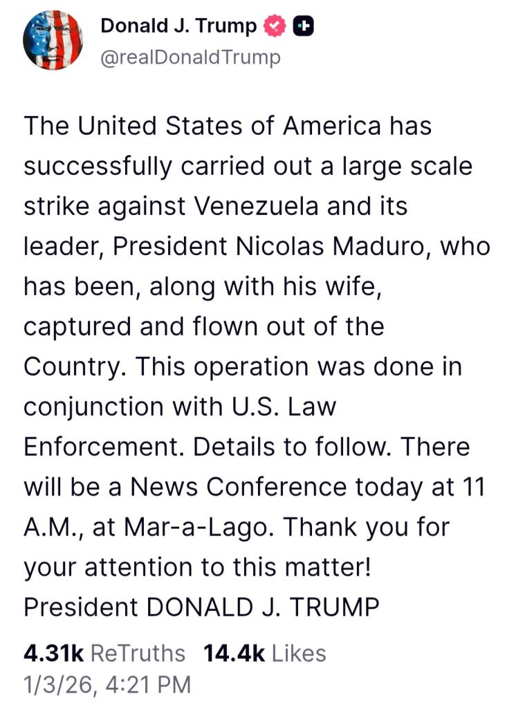 ด่วน!! สหรัฐฯ จับ 'มาดูโร' พร้อมภรรยา คุมตัวออกจากเวเนซุเอลาแล้ว เผยแพร่: 3 ม.ค. 2569 17:10 ปรับปรุง: 3 ม.ค. 2569 17:21 โดย: ผู้จัดการออนไลน์ ประธานาธิบดี โดนัลด์ ทรัมป์ แห่งสหรัฐฯ กล่าวเมื่อวันเสาร์ (3 ม.ค.) ว่า สหรัฐฯ ได้จับกุมประธานาธิบดี นิโคลัส มาดูโร แห่งเวเนซุเอลและภรรยา และนำตัวพวกเขาขึ้นเครื่องบินออกนอกประเทศแล้ว รายละเอียด...