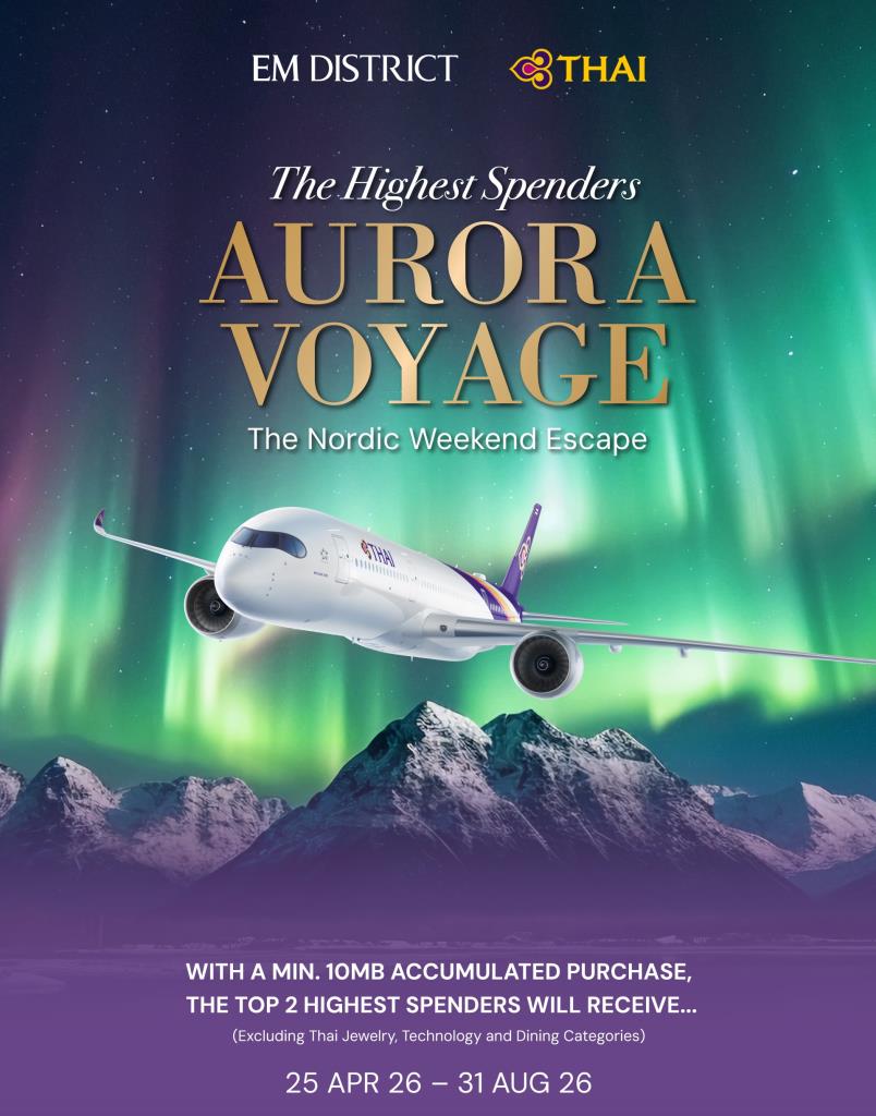 แคมเปญดังกล่าวครอบคลุมการช้อปใน 3 ศูนย์การค้าชั้นนำของไทย EM DISTRICT ได้แก่ EMPORIUM, EMQUARTIER และ EMSPHERE โดยมุ่งมั่นในการยกระดับศูนย์การค้าให้เป็นมากกว่าจุดหมายปลายทางของการช้อปปิ้ง แต่เป็นศูนย์กลางของประสบการณ์ไลฟ์สไตล์ที่ครบครันและตอบโจทย์ผู้บริโภคในทุกมิติ “EM DISTRICT AURORA VOYAGE” จึงเป็นอีกหนึ่งบทพิสูจน์ของ EM DISTRICT ในการสร้างสรรค์สิทธิประโยชน์ที่มีความหมาย ผ่านความร่วมมือกับพันธมิตรระดับโลก เพื่อมอบประสบการณ์ที่เหนือความคาดหมายในทุกการใช้จ่ายให้กับลูกค้า