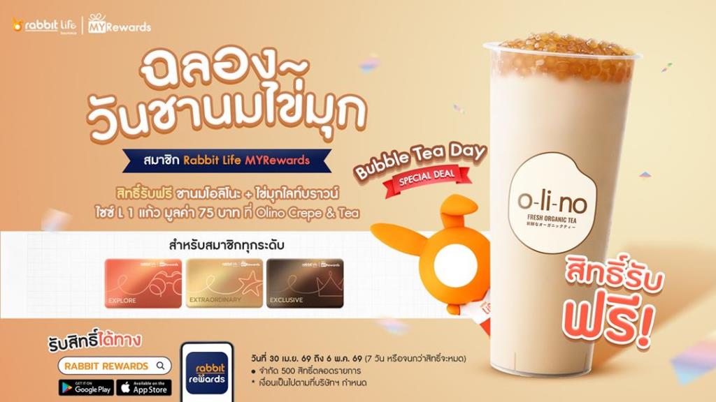 บริษัท แรบบิท ประกันชีวิต จำกัด (มหาชน) หรือ Rabbit Life บริษัทในเครือบริษัท บีทีเอส กรุ๊ป โฮลดิ้งส์ จำกัด (มหาชน) ชวนสมาชิกRabbit Life MYRewards ฉลอง“วันชานมไข่มุกแห่งชาติ” แบบคูล ๆ กับแคมเปญ “Bubble Tea Day Special Deal” บอกเลยสายชานมต้องห้ามพลาด เพียงกดรับสิทธิ์ก็รับฟรีทันที “ชานมโอลิโนะ พร้อมไข่มุกไลท์บราวน์” ไซซ์L จำนวน 1 แก้ว มูลค่า 75 บาท จากร้าน O-lino Crepe & Tea (เฉพาะสาขาที่ร่วมรายการ) พร้อมให้ซัมเมอร์นี้ได้จิ