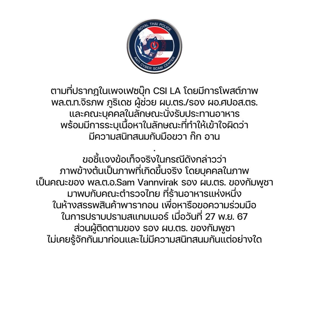 เมื่อวันที่ 27เม.ย.69ศูนย์ต่อต้านการฉ้อโกงออนไลน์ (ACSC) ภายใต้การอำนวยการ พล.ต.อ.ธนา ชูวงศ์ รอง ผบ.ตร./ผอ.ศปอส.ตร. และ พล.ต.ท.จิรภพ ภูริเดช ผู้ช่วย ผบ.ตร./รอง ผอ.ศปอส.ตร.โพสต์ข้อความระบุว่า ตามที่ปรากฏในเพจเฟซบุ๊ก CSI LA โดยมีการโพสต์ภาพ พล.ต.ท.จิรภพ และคณะบุคคลในลักษณะนั่งรับประทานอาหาร พร้อมมีการระบุเนื้อหาในลักษณะที่ทำให้เข้าใจผิดว่ามีความสนิทสนมกับมือขวา ก๊ก อาน