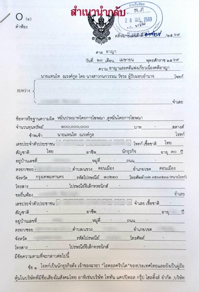 คดีนี้ โจทก์ยื่นฟ้องในข้อหา “หมิ่นประมาทโดยการโฆษณา” ตามประมวลกฎหมายอาญา มาตรา 328, มาตรา 393, มาตรา 59 วรรคสอง จากการเผยแพร่ข้อความผ่านสื่อสังคมออนไลน์ไปยังบุคคลจำนวนมาก จึงเรียกร้องค่าเสียหายรวม 100,000,000 บาท (หนึ่งร้อยล้านบาทถ้วน) พร้อมดอกเบี้ยร้อยละ 5 ต่อปี นับแต่วันฟ้องจนกว่าจะชำระเสร็จ โดยศาลนัดไต่สวนมูลฟ้อง วันที่ 30 มิถุนายน 2569 เวลา 16.30 น.