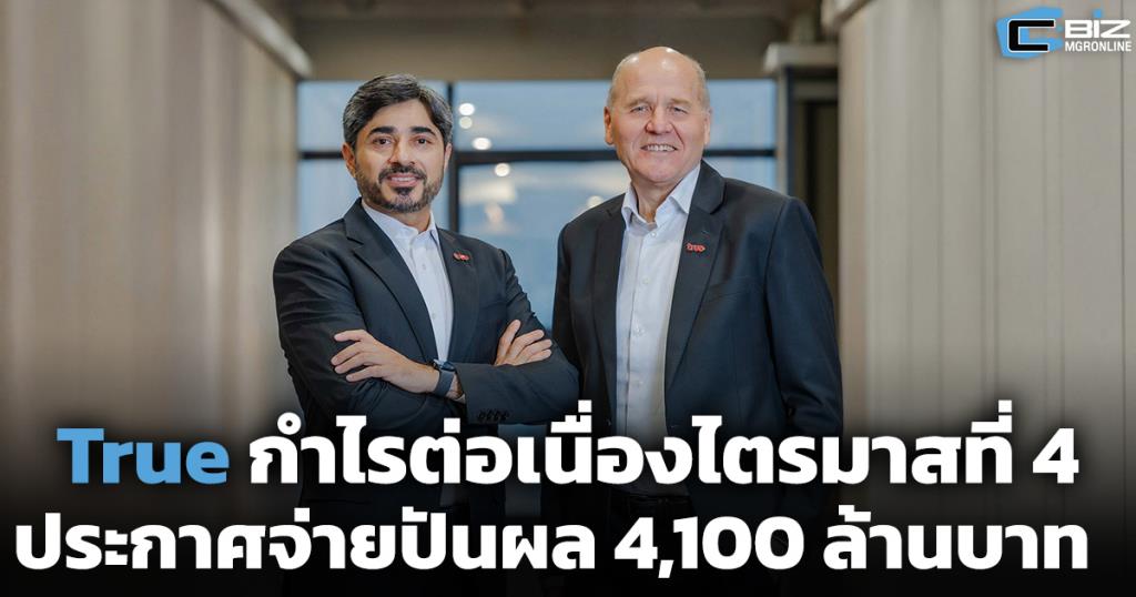 True กำไรต่อเนื่องไตรมาสที่ 4 ประกาศจ่ายปันผล 4,100 ล้านบาท เผยแพร่: 19 ก.พ. 2569 18:03 ปรับปรุง: 19 ก.พ. 2569 18:03 โดย: ผู้จัดการออนไลน์ ทรู คอร์ปอเรชั่น ประกาศผลประกอบการไตรมาส 4/2568 ทำกำไรสุทธิได้ต่อเนื่องเป็นไตรมาสที่ 4 โดยรายงานผลกำไรสุทธิหลังหักภาษี 4,000 ล้านบาท และกำไรสุทธิหลังปรับปรุงรายการพิเศษ (Normalized Profit) จำนวน 6,100 ล้านบาท สำหรับ EBITDA ในไตรมา รายละเอียด... True