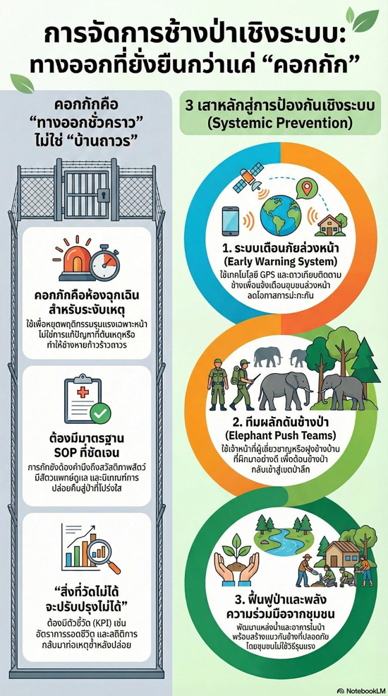 คอกขังเดี่ยวช้างป่า แก้ปัญหาคนฆ่าช้าง ช้างฆ่าคน ได้จริงหรือไม่? เผยแพร่: 18 ก.พ. 2569 19:13 ปรับปรุง: 18 ก.พ. 2569 19:13 โดย: น.สพ.เผด็จ ศิริดำรง และ รศ.ดร.อานนท์ ศักดิ์วรวิชญ์ เราต้องเข้าใจก่อนว่าเดิมช้างก็เป็นช้างป่าทั้งหมด (Wild elephant) แล้ววิชาคชบาลของไทยก็มีการคล้องช้าง มีการสร้างเพนียดคล้องช้างป่า เพื่อนำมาฝึกให้เป็นช้างบ้าน (Domesticated elephant) รายละเอียด... ช้างป่า วิชาคชบาล