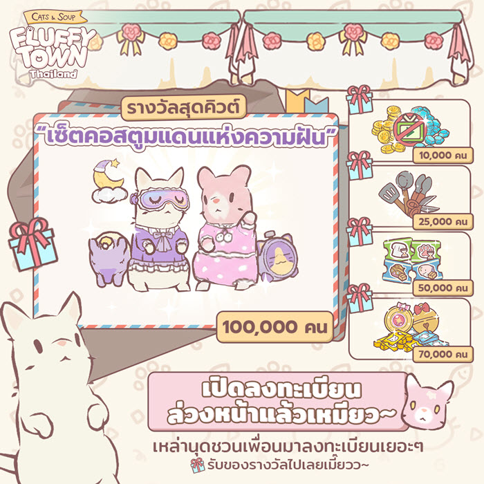 เพื่อฉลองการเปิดตัวลงทะเบียนล่วงหน้าในเซิร์ฟเวอร์ไทย พิเศษสุดสำหรับเหล่าทาสแมวเตรียมรับของรางวัลมากมายกันไปแบบยกเซิร์ฟ ที่จะช่วยทำให้เล่นกันได้แบบสะดวกสบาย เมื่อยอดลงทะเบียนครบตามเป้าหมายที่กำหนด (เมื่อเกมเปิดให้บริการ จะได้รับของรางวัลผ่านจดหมายภายในเกม เมื่อตัวละครมีเลเวล 7) นอกจากนี้ยังมีกิจกรรมพิเศษแจกของรางวัลอีกมากมายตั้งแต่วันแรกที่เข้าเล่นเกม ให้กับผู้เล่นทุกคน ไม่ว่าจะเป็นเพชร, ทอง, ไอเทมวัตถุดิบต่างๆ ไปจนถึงคอสตูมสุดน่ารัก