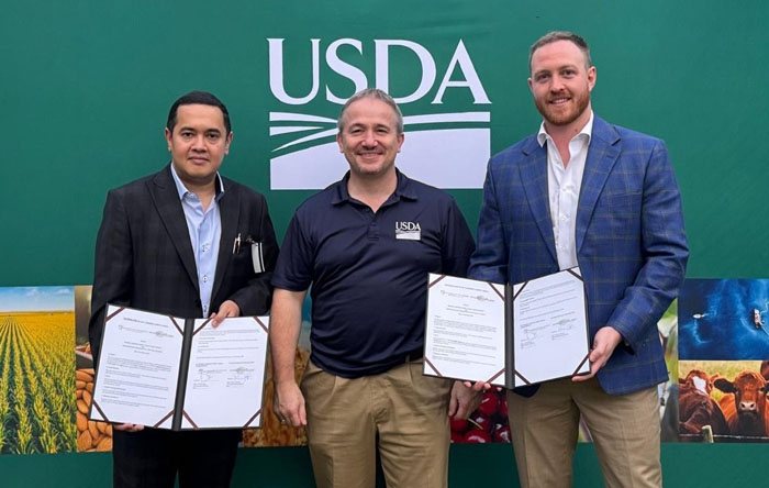 วานนี้ (25 ก.พ. 69) สถานทูตสหรัฐอเมริกา ประจำเมียนมา ได้โพสต์ภาพชุดพิธีเซ็นสัญญาซื้อขายกากถั่วเหลือง ระหว่างสภาผู้ส่งออกถั่วเหลืองสหรัฐอเมริกา (U.S. Soybean Export Council : USSEC) กับตัวแทนบริษัทผู้รับซื้อกากถั่วเหลืองของเมียนมา โดยมีตัวอักษร USDA ซึ่งเป็นตัวย่อของกระทรวงเกษตรแห่งสหรัฐอเมริกา (United States Department of Agriculture) อยู่บนพื้นฉากด้านหลัง