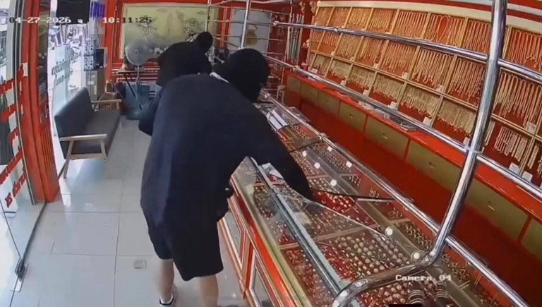 (คลิป) 2 คนร้ายสวมไอ้โม่ง ควงปืนบุกปล้นร้านทองโคราช กวาดแหวนทองกว่า 30 วง ซิ่งเก๋งยาริสหลบหนี