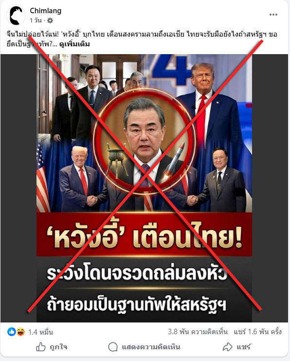 ข่าวปลอม! “หวังอี้” เตือนไทยระวังโดนจรวดถล่มลงหัว หากยอมให้อเมริกาตั้งฐานทัพ