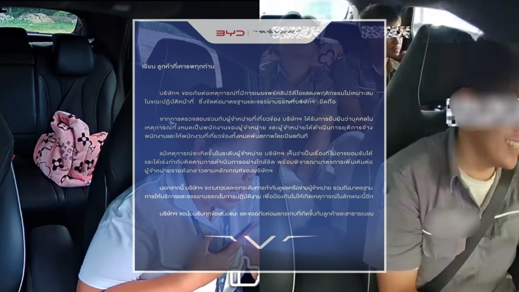 BYD ออกแถลงการณ์ขอโทษสังคม พร้อมสั่งฟัน 'ไล่ออกยกเซ็ต' มีผลทันที ชี้เป็นพฤติกรรมที่รับไม่ได้และขัดต่อจรรยาบรรณบริษัทอย่างร้ายแรง ยันเตรียมยกระดับมาตรฐานผู้จำหน่ายทั่วประเทศเพื่อป้องกันเหตุซ้ำรอย
