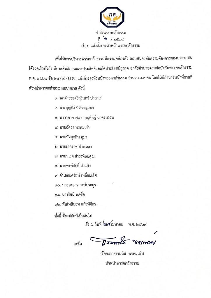 วันนี้ (28 เม.ย.) ผู้สื่อข่าวรายงานว่า ร.อ.ธรรมนัส พรหมเผ่า หัวหน้าพรรคกล้าธรรม ลงนามในคำสั่งที่ 6 / 2569 เรื่อง แต่งตั้งรองหัวหน้าพรรคกล้าธรรม เพื่อให้การบริหารพรรคกล้าธรรม มีความคล่องตัว ตอบสนองต่อความต้องการของประชาชน ได้รวดเร็วทั่วถึง มีประสิทธิภาพและประสิทธิผลเกิดประโยชน์สูงสุด โดยอาศัยอำนาจตามข้อบังคับพรรคกล้าธรรม พ.ศ. 2568 ข้อ 20 (1) (ก) (ข) แต่งตั้งรองหัวหน้าพรรคกล้าธรรม จำนวน 12 คน โดยให้มีอำนาจหน้าที่ตามที่หัวหน้าพรรคกล้าธรรมมอบหมาย ดังนี้