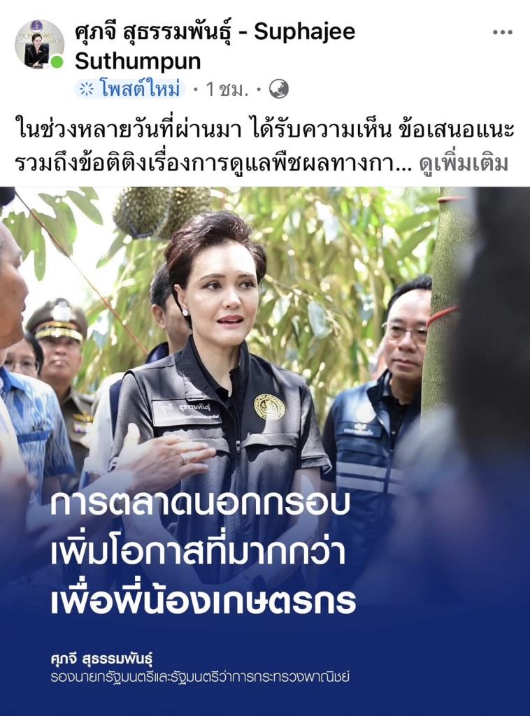 วันนี้(30 เม.ย.)นางศุภจี สุธรรมพันธุ์ รองนายกรัฐมนตรีและรัฐมนตรีว่าการกระทรวงพาณิชย์ โพสต์เฟสบุ๊ค “ศุภจี สุธรรมพันธุ์ - SuphajeeSuthumpun”ว่า ในช่วงหลายวันที่ผ่านมา ได้รับความเห็น ข้อเสนอแนะ รวมถึงข้อติติงเรื่องการดูแลพืชผลทางการเกษตร โดยเฉพาะ “ทุเรียน”