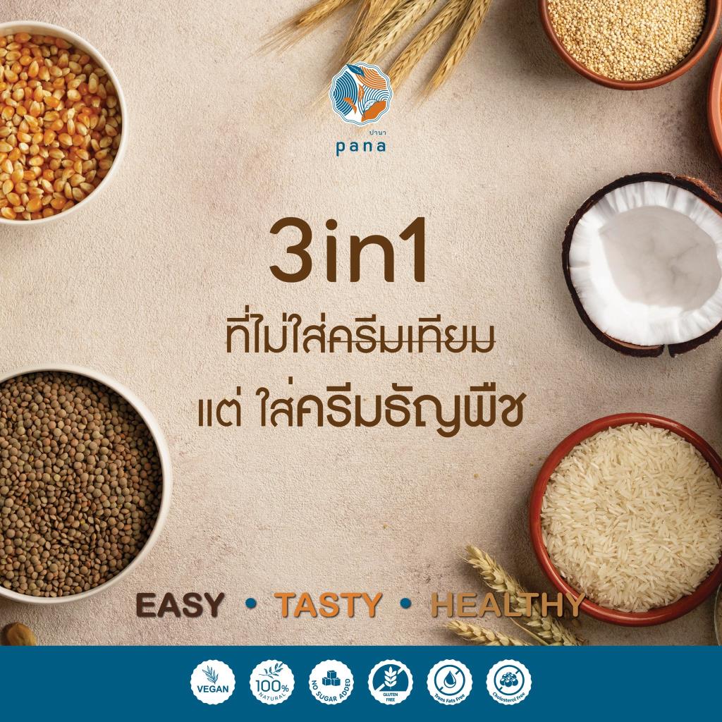 จากคนรักสุขภาพ มองหาเครื่องดื่ม 3 in 1 ปราศจากน้ำตาลและครีมเทียม พอไม่มีในท้องตลาดตัดสินใจผลิตเอง ได้เป็นที่มาของ Pana 3in1 plant based drink เครื่องดื่มปราศจากครีมเทียมและน้ำตาล แต่ได้ความหวาน และความัน จากข้าวหอมมะลิ ถั่ว กะทิ และข้าวโพด ที่สำคัญกว่านั้น ได้ดื่ม กาแฟ ชาไทย และ ช็อกโกแลต 3 in 1 รสชาติดี ไม่ต่างจากที่เคยกินในท้องตลาด