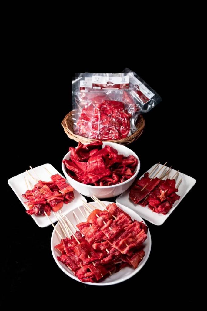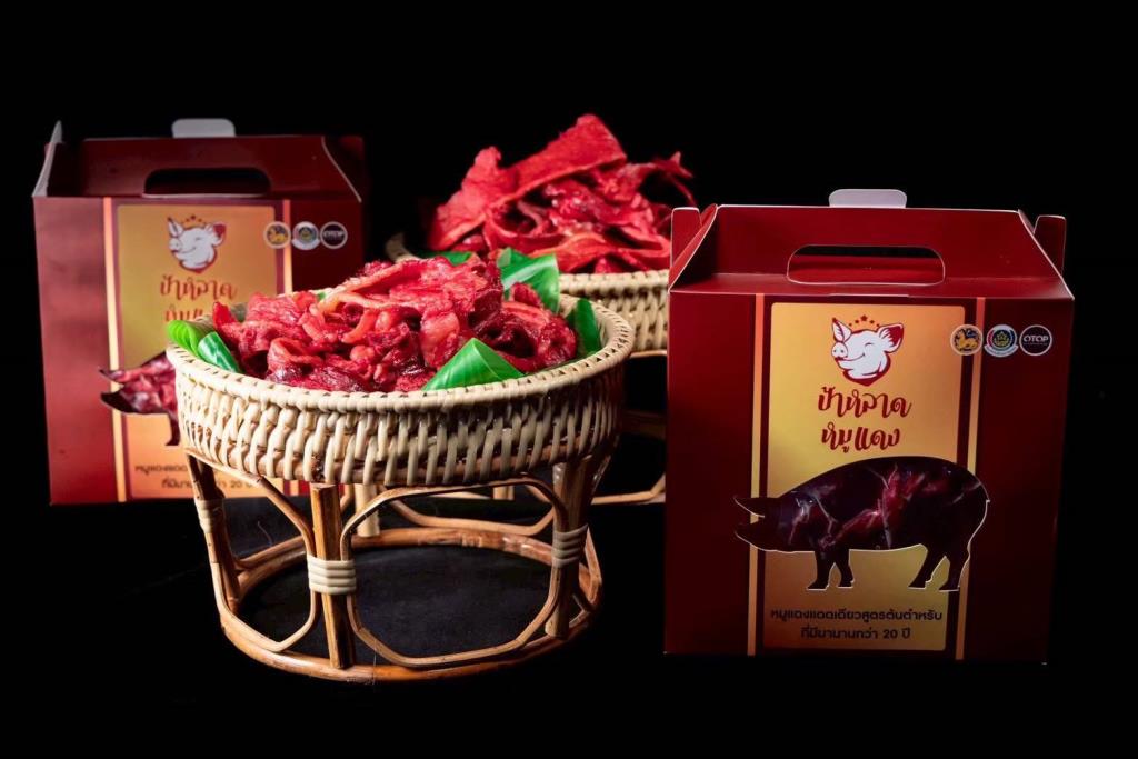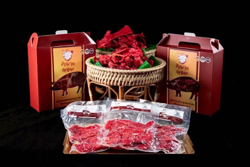 2.การออกแบบแพคเกจสำหรับสินค้าที่หลากหลาย คุณอ้อมออกแบบบรรจุภัณฑ์ใหม่ด้วยตัวเองเพื่อเปลี่ยนภาพลักษณ์ OTOP ให้กลายเป็น "ของฝากพรีเมียม" ที่ทันสมัย ขณะเดียวกันก็พัฒนาผลิตภัณฑ์ให้ครอบคลุมทุกกลุ่มเป้าหมาย ไม่ว่าจะเป็น หมูแบบนุ่ม สำหรับคนชอบเนื้อสัมผัสเคี้ยวง่าย, แบบไร้มัน สำหรับสายสุขภาพ, หรือ แบบติดมัน ที่ให้ความหอมมันเป็นพิเศษเมื่อนำไปย่าง และที่ขาดไม่ได้คือ “น้ำพริกข่า” สูตรเด็ดอาหารถิ่นที่ทานคู่กับจิ้นแดงได้อย่างลงตัว