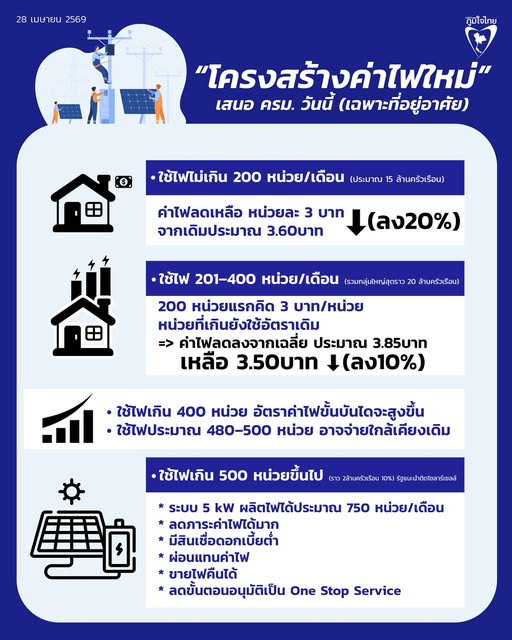 “ค่า FTหรือค่าไฟฟ้าผันแปร สะท้อนต้นทุน ซึ่งขึ้นง่าย ลงยาก รัฐมนตรีพลังงานบอกจะมีการปรับโครงสร้างค่าไฟฟ้าใหม่ เริ่มรอบบิลใหม่ 1 พ.ค.นี้ ตามที่ กกพ. เห็นชอบสูตรปรับค่า Ft งวดเรียกเก็บพฤษภาคม – สิงหาคม เพิ่มขึ้น 7 สตางค์ จากงวดมกราคม-เมษายน 2569 ที่มีอัตราค่าไฟฟ้าเรียกเก็บเฉลี่ยอยู่ที่ 3.88 บาทต่อหน่วย ไม่รวม VAT”