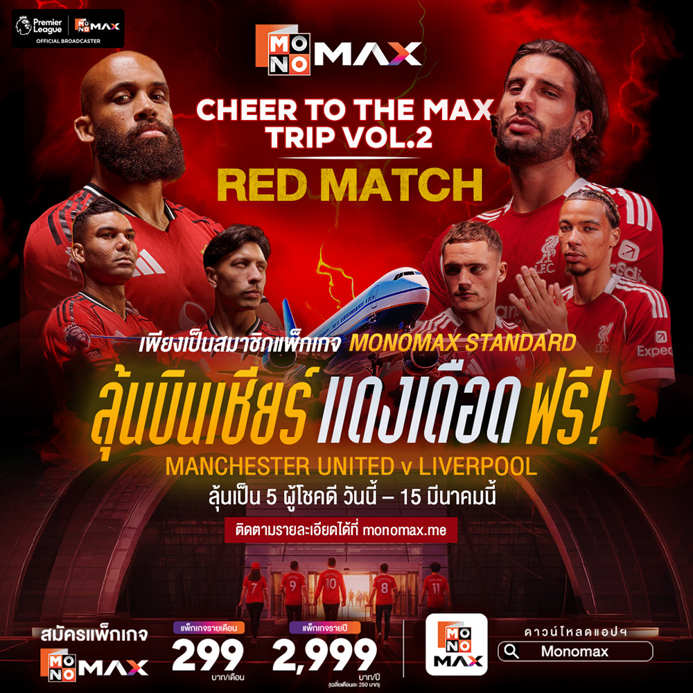 Monomax แพลตฟอร์มหลักในการถ่ายทอดสดฟุตบอลพรีเมียร์ลีกและเอมิเรตส์เอฟเอคัพตลอด 6 ฤดูกาล ตอกย้ำประสบการณ์คอบอลตัวจริง เปิดแคมเปญเอ็กซ์คลูซีฟแห่งปี “CHEER TO THE MAX TRIP VOL.2 : RED MATCH” มอบโอกาสให้สมาชิกแพ็กเกจ Monomax Standard ลุ้นเป็น 1 ใน 5 ผู้โชคดีสร้างโมเมนต์ครั้งหนึ่งในชีวิตที่แฟนบอลห้ามพลาด! บินลัดฟ้าสัมผัสบรรยากาศ “ศึกแดงเดือด” ระหว่าง แมนเชสเตอร์ ยูไนเต็ด พบ ลิเวอร์พูล แบบใกล้ชิดติดขอบสนามโอลด์แทรฟฟอร์ด ณ เมืองแมนเชสเตอร์ ประเทศอังกฤษ ในวันที่ 2 พฤษภาคม 2569