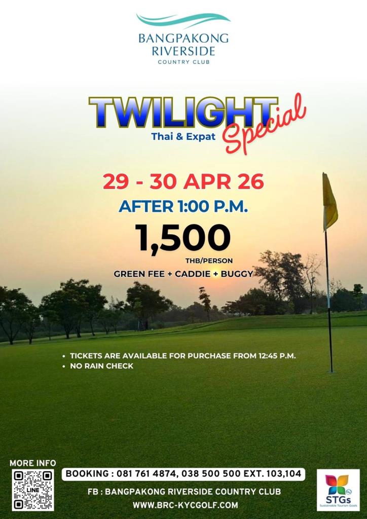 สนามบางปะกง ริเวอร์ไซด์ คันทรี คลับ จ.ฉะเชิงเทรา จัด “Twilight Special” เฉพาะออกรอบวันพุธที่ 29 และวันพฤหัสบดีที่ 30 เมษายน 2569 หลัง 13.00 น. ราคา 1,500 บาท (รวมกรีนฟี แคดดี้ และรถกอล์ฟ) สอบถามรายละเอียดเพิ่มเติมโทร. (038) 500-500, 081-761-4874 หรือเว็บไซต์ www.brc-golfcourse.com