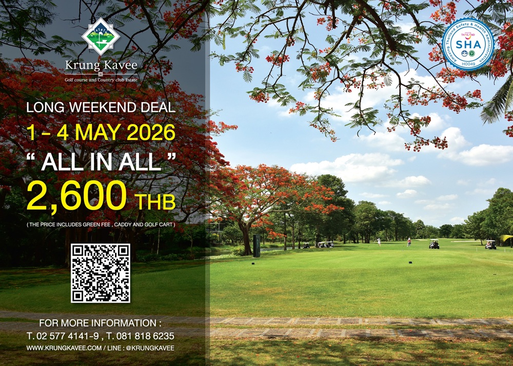 สนามกอล์ฟกรุงกวี ถนนรังสิต-นครนายก คลอง 4 เสนอ “Long Weekend Deal” ออกรอบระหว่างวันที่ 1-4 พฤษภาคม 2569 ราคา 2,600 บาท (รวมกรีนฟี แคดดี้ และรถกอล์ฟ) สอบถามรายละเอียดเพิ่มเติมและจองเวลาออกรอบโทร 02-577-4141-9, 081 818 6235, ไลน์ไอดี: krungkavee หรือเว็บไซต์ www.krungkavee.com