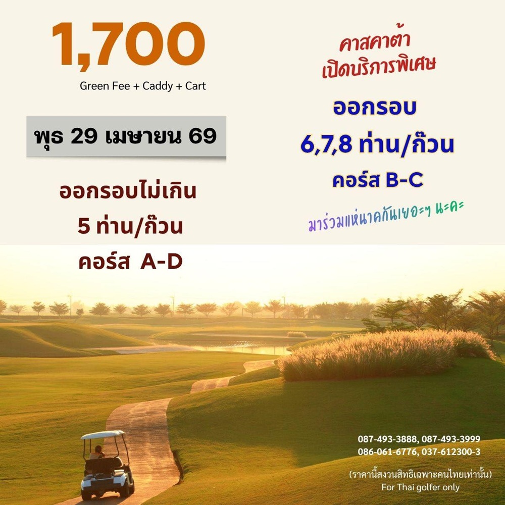 สนามคาสคาต้า กอล์ฟ คลับ อ.องครักษ์ จ.นครนายก มีโปรโมชั่นสำหรับชาวไทย เฉพาะออกรอบวันพุธที่ 29 เมษายน 2569 ราคา 1,700 บาท (รวมกรีนฟี แคดดี้ และรถกอล์ฟ) สอบถามรายละเอียดเพิ่มและจองเวลาออกรอบโทร 037-612-300-3, 086-061-6776, 087-493-3888, 087-493-3999 ไลน์ไอดี: cascatagolf หรือเว็บไซต์ www.cascata.co.th