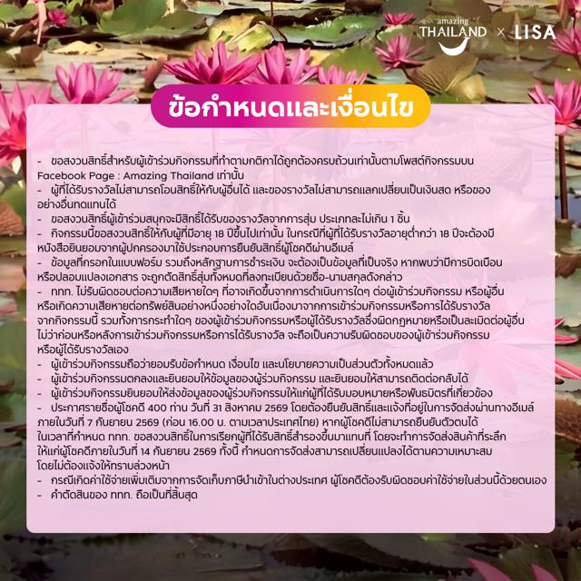 การประกาศรางวัล: วันที่ 31 สิงหาคม 2569 (รวมประกาศครั้งเดียวทั้งหมด 400 รางวัล) ผ่านช่องทาง Facebook: Amazing Thailand