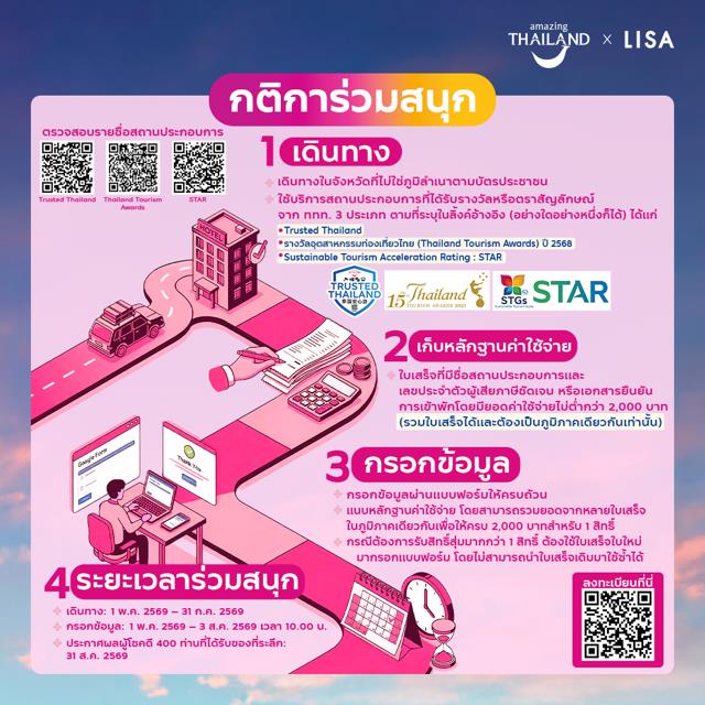 ททท. จุดประกายการเดินทางทั่วไทยไปกับ “ลิซ่า” ภายใต้กิจกรรม “Feel All the Feelings, Seeking Thailand’s Wonders” ชวนเที่ยวทั่วไทย ร่วมสนุก 2 วิธีลุ้นรับของที่ระลึกสุดพิเศษ 5 สไตล์ โดยสามารถร่วมสนุกได้ตั้งแต่วันที่ 1 พฤษภาคม 2569 ถึง 31 กรกฎาคม 2569